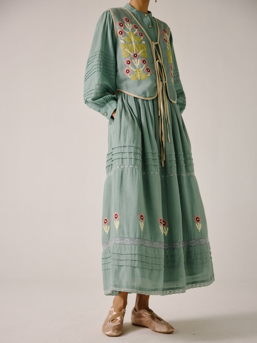 The Cara Set brings a fresh pop of color with its serene pale blue hue and intricate pixel applique. This three-piece ensemble includes the Hazel top, Janet gilet, and Emily skirt, all crafted from soft cotton. The layering of the gilet over the top adds dimension, while the flowy skirt enhances comfort. Style this set with strappy sandals and a woven tote bag for a chic summer brunch. Light jewelry and a messy bun can add a touch of elegance to this playful yet polished look.