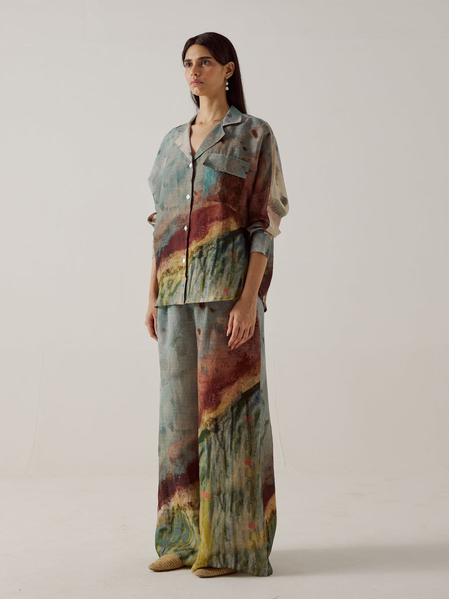 For ultimate comfort without compromising style, the Lounge Set is a must-pack. This two-piece set includes a hand-painted botanical print lounge shirt and matching pants made from handwoven linen. With pleats and an elastic waistband, the pants provide freedom of movement, while the notched collar shirt adds a refined touch. Perfect for lazy mornings, in-flight comfort, or a casual day exploring the hinterlands.