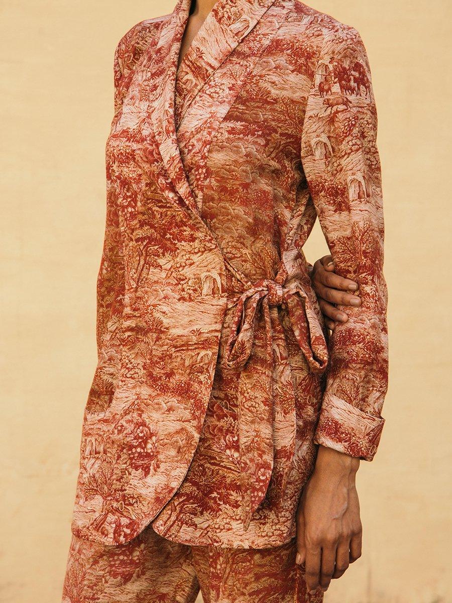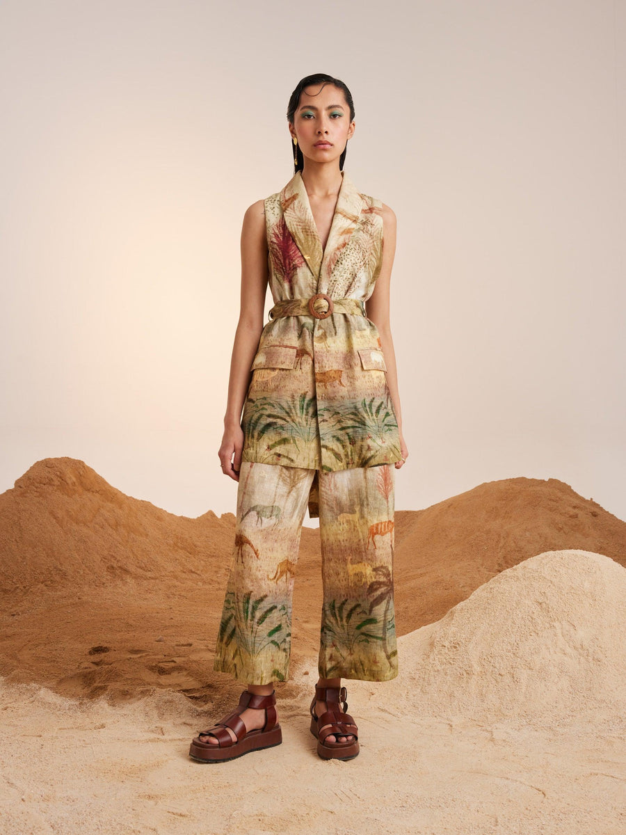 Step out in sophistication with the Summer Blazer Set, featuring a sleeveless cut blazer with crisp lapels made in handwoven linen fabric in the striking Woods print. The matching pants are made in the same pure linen and include a front button fastening. With a belt to cinch the waist, this set is perfect for a polished daytime look or an evening dinner in Melbourne.