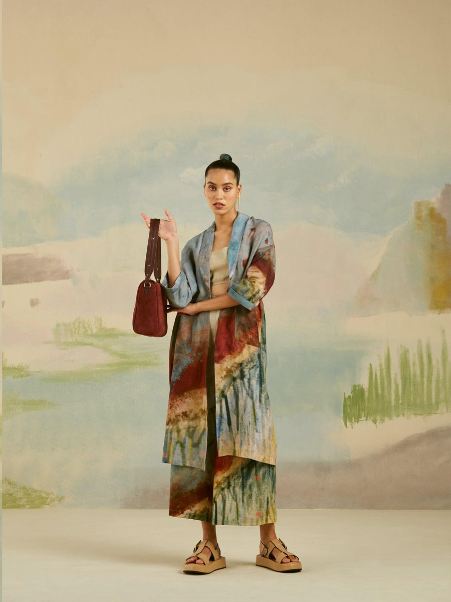 For those who prefer a relaxed yet elegant ensemble, the Peru Set is a three-piece co-ord including a free-size overlay jacket, wide-leg pants, and a solid beige bustier. The overlay jacket features three-quarter sleeves, shawl collars, pockets, and a center button, while the pants include pockets and front darts for ease of movement. Hand-finished in 100% pure linen from Bhagalpur, India, this set is ideal for long flights, city strolls, or cozy café visits.