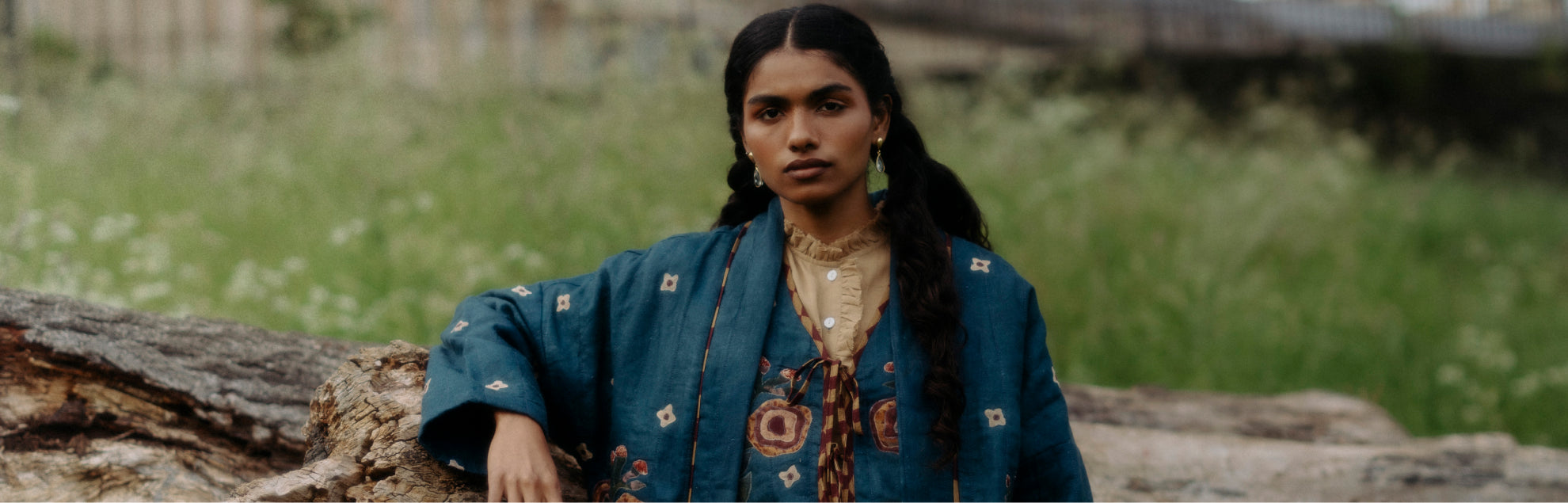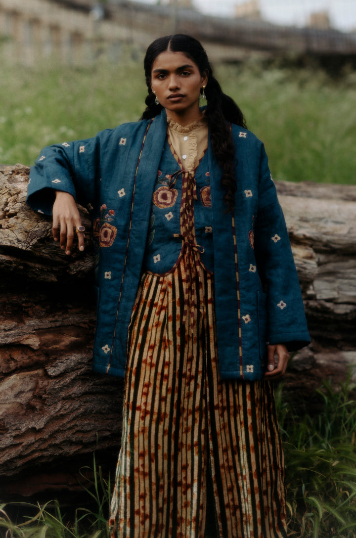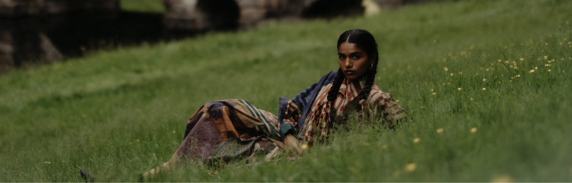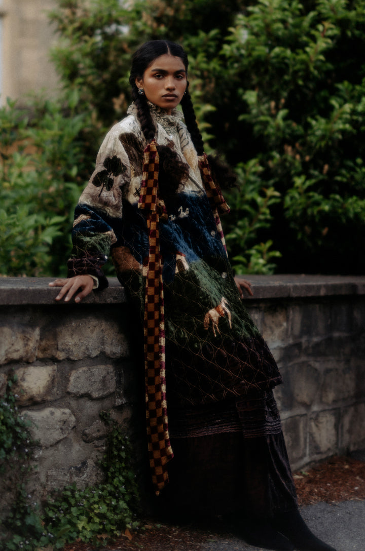 What are the joys that my heart treasures? Is it that gentle face and silent smile, the whispers of the women passing by, the aroma of the broths tempting my appetite, or the sky blushing with tints of crimson and tangerine? I sit here in the fading light, wondering how these fleeting everyday encounters leave behind echoes that ripple through infinities of time. Even after the last shard of joy has vanished, we reminisce about their presence as a guardian of our past, guiding us through the mist of uncertainty. Each moment, each shared experience reverberates within us - shaping our identities. As fall whispers its presence with the brisk wind, we embrace relaxed silhouettes draped in wool and velvet. With surreal prints, vibrant appliques, and intricate embroideries, these pieces transcend the boundaries of physical presence, leaving behind a legacy of joy, celebration, and reflection.