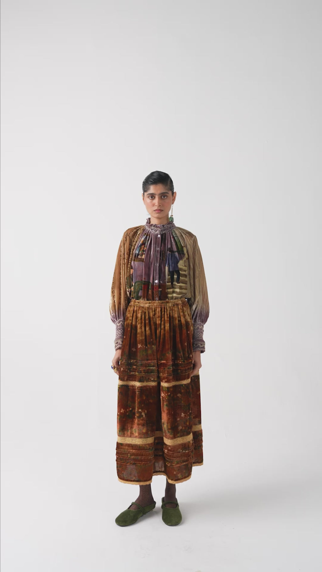 The Farmer Top is made from velvet fabric in Living room print. It features hand-smocking details on the neck and the bishop sleeves, along with front button details. Our classic Emily skirt, now crafted in velvet fabric adorned with a charming print for a cosy, stylish feel of comfort and elegance.