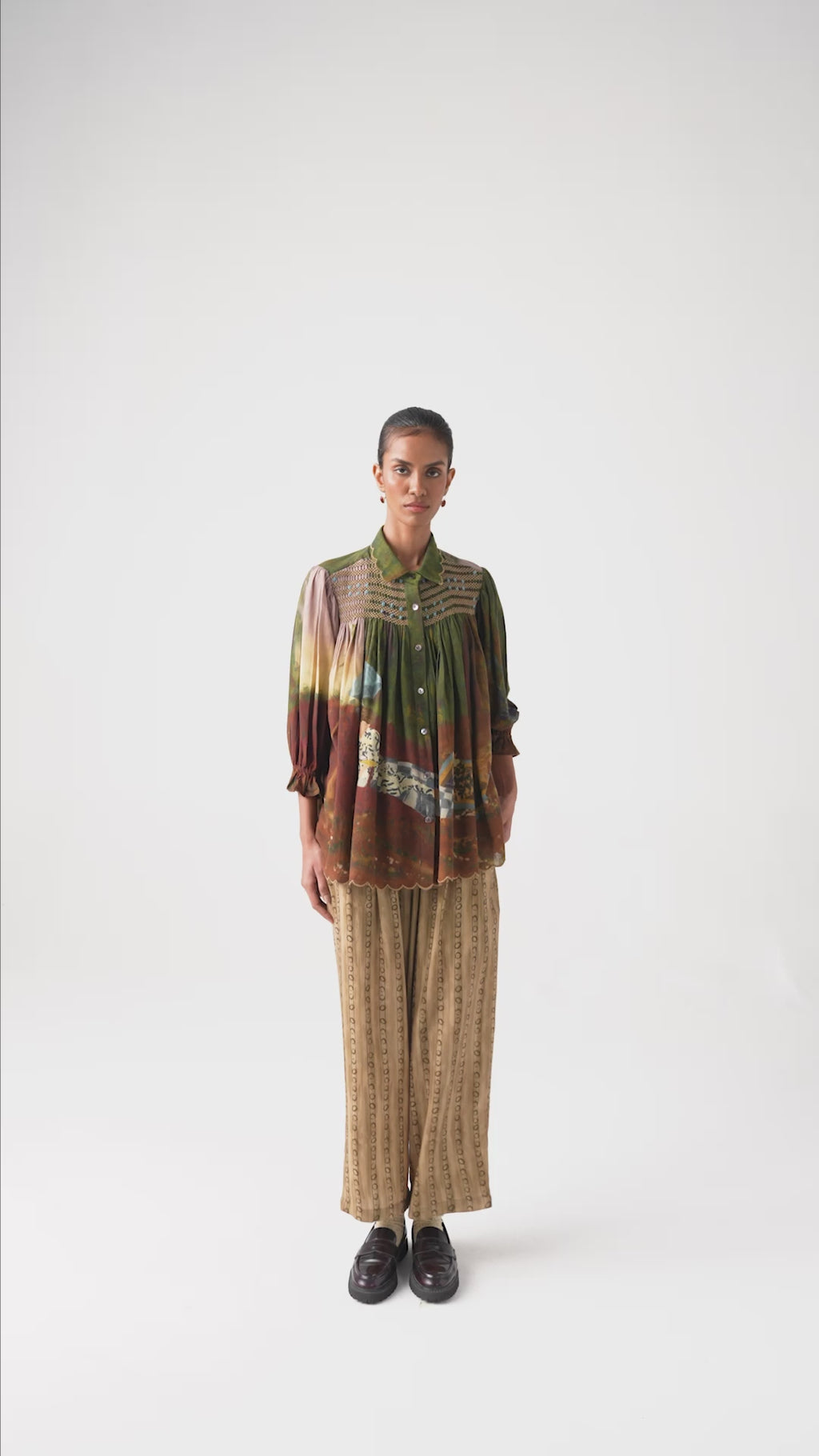 Silhouette: Button-down shirt Yoke: Hand-smocked detailing for added texture Sleeves: Full sleeves with ruffled elasticated cuffs Hem: Scalloped hem for a delicate, feminine touch Fit: Effortless and versatile for everyday wear