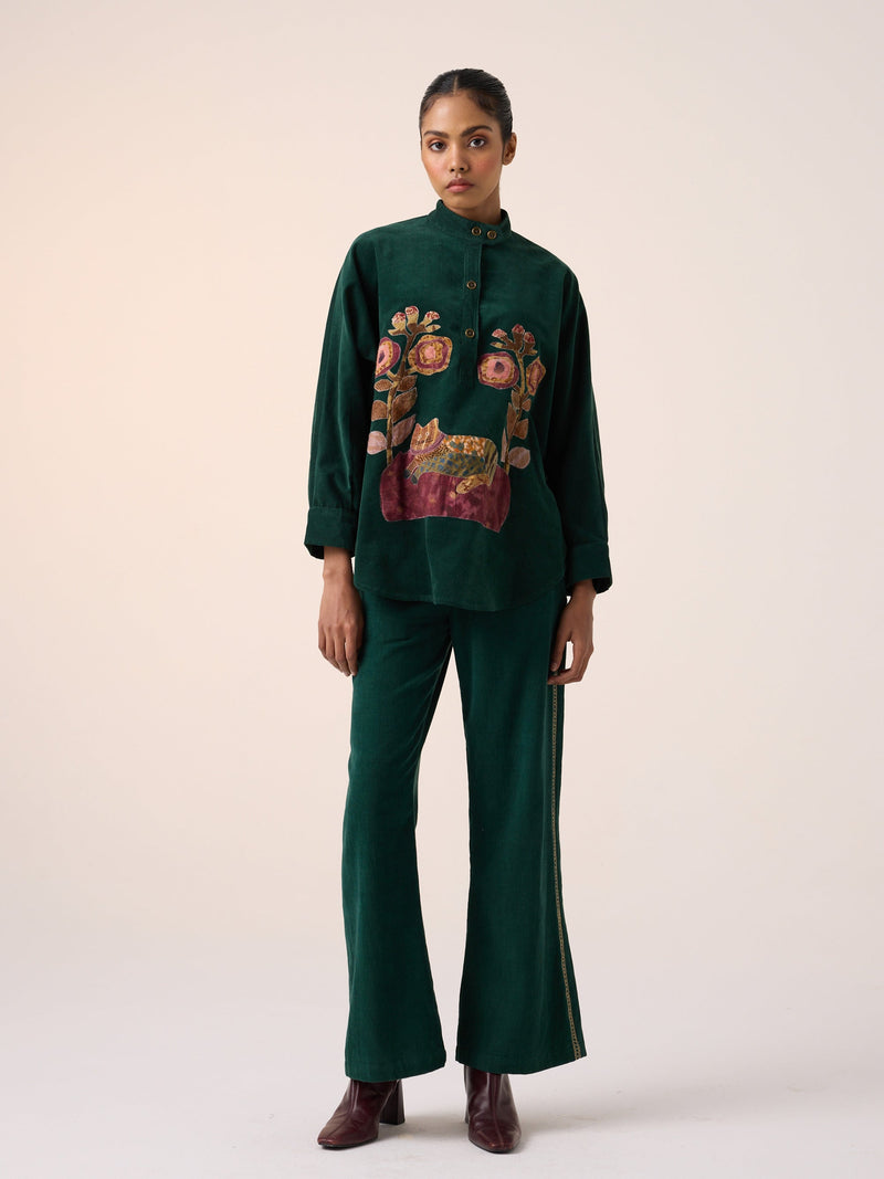 Kiera shacket featuring appliqu�� details in the front and has button fastening on the cuffs as well as on the neck. A classic play of panels high quality durable corduroy on a straight fit collar less jacket
